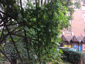 giậu mồng tơi xanh rờn= hàng rào ngăn hai sân vườn bằng các cây mồng tơi, dây leo bò rậm rạp, các cây mồng tơi tốt tươi, lá mồng tơi xanh bóng/ xanh rờn.