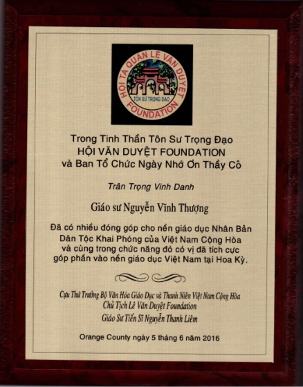 Từ cuối năm 2014 đến nay: về hưu, đọc sách, viết lách và hưởng nhàn; cộng tác với các Website Thư Viện Hoa Sen, Trang Nhà Quảng Đức, Chùa A-di-đà Australia, An Phong An Bình - GS Nguyễn Vĩnh Thượng được vinh danh là nhà giáo dục đã có công với nền Giáo dục Quốc gia Việt Nam trước 1975, trong Ngày Tôn Sư Trọng Đạo năm 2016 do Hội Lê Văn Duyệt Foundation tổ chức long trọng vào trưa Chúa Nhật ngày 05 tháng 6 năm 2016 tại Nam California – USA.