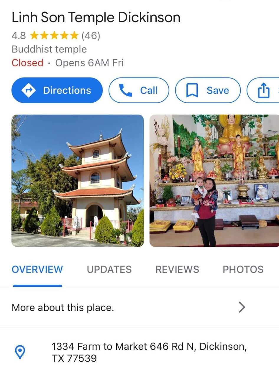 Chùa Linh Sơn cách xa khu phố thương mại của người Việt-Nam tị nạn ở Houston bốn mươi lăm phút lái xe. Ngôi chùa với lối kiến trúc khéo léo và cổ kính trân mình giữa buổi trưa tháng sáu oi ả không một bóng khách vãng lai. Sân chùa rộng rãi với hồ sen trắng tạo nên một cảm giác thanh tịnh và an bình.