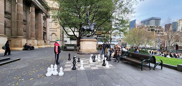 Bàn cờ quốc tế sân trước Thư viện bang Victoria.