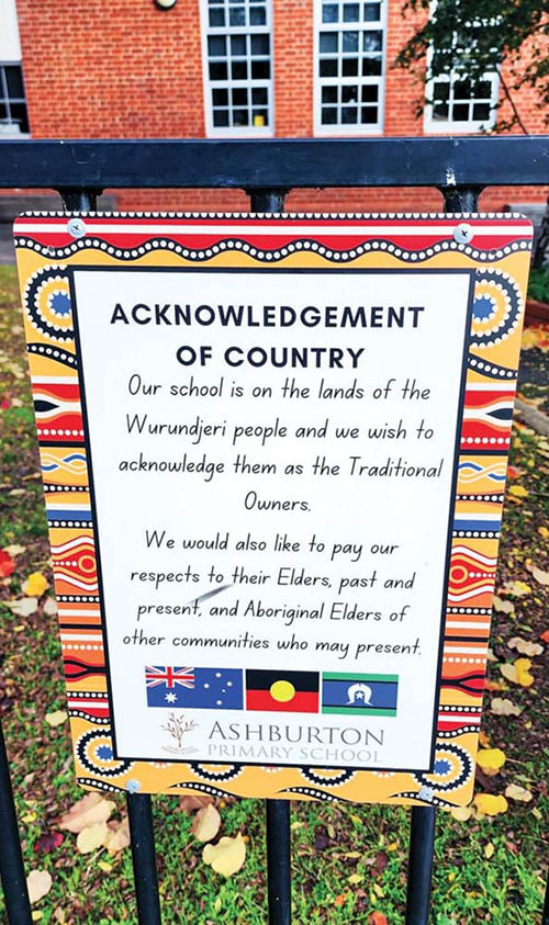 Bảng tri ân thổ dân tại một trường phổ thông ở Melbourne.