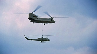 Chưa quen lắm với loại động cơ J85 của F-5, thì tôi lại được điều qua phi đạo trực thăng, vì sư đoàn 3 KQ, chính thức tiếp nhận phi đoàn đầu tiên là 223, mà sân đáp ghép bởi những vỉ sắt. Tôi và vài người bạn được một chuyên viên Hoa Kỳ hướng dẫn để tập sửa chữa những pan của động cơ. Thực ra, trong khoá học, nhà trường đã lấy động cơ T53-L-13 làm mẫu, nên chúng tôi rất mau hiểu. Khác với F5, sửa trực thăng thì phải đi theo khi bay thử, lần đầu tiên ngồi trực thăng thật thú vị, cảm giác được bay bổng và thích thú với phong cảnh vùn vụt lùi lại sau mình, nhất là như thấy mình đang lướt trên những ngọn cây, phải một thời gian tôi mới quen với độ cao và tốc độ. Test pilot là một sĩ quan Hoa Kỳ, tôi không nhớ cấp bậc, chỉ nhớ anh em gọi ông là Mr. White. Ông bay rất vững, tính tình cởi mở, từng độ cao ông giải thích cho tôi từng chỉ số normal mà những đồng hồ trên phi kế hiển thị. Ít lâu sau, thì có những test pilot của KQVN, tôi nhớ không nhầm thì người đầu tiên là trung uý Tùng, sau lên đại uý, với nước da ngăm đen, khoẻ mạnh. Ông điều khiển trực thăng một cách thuần thục, tư thái rất ung dung, ngồi cạnh ông tôi có cảm tưởng ông chẳng bận tâm gì đến động tác bay, chính đại uý Tùng thấy tôi thích nên trong lúc bay thử thường chỉ tôi bay bình phi, vì khi bay thử tôi thường ngồi ghế co-pilot, để dễ theo dõi bảng phi kế.