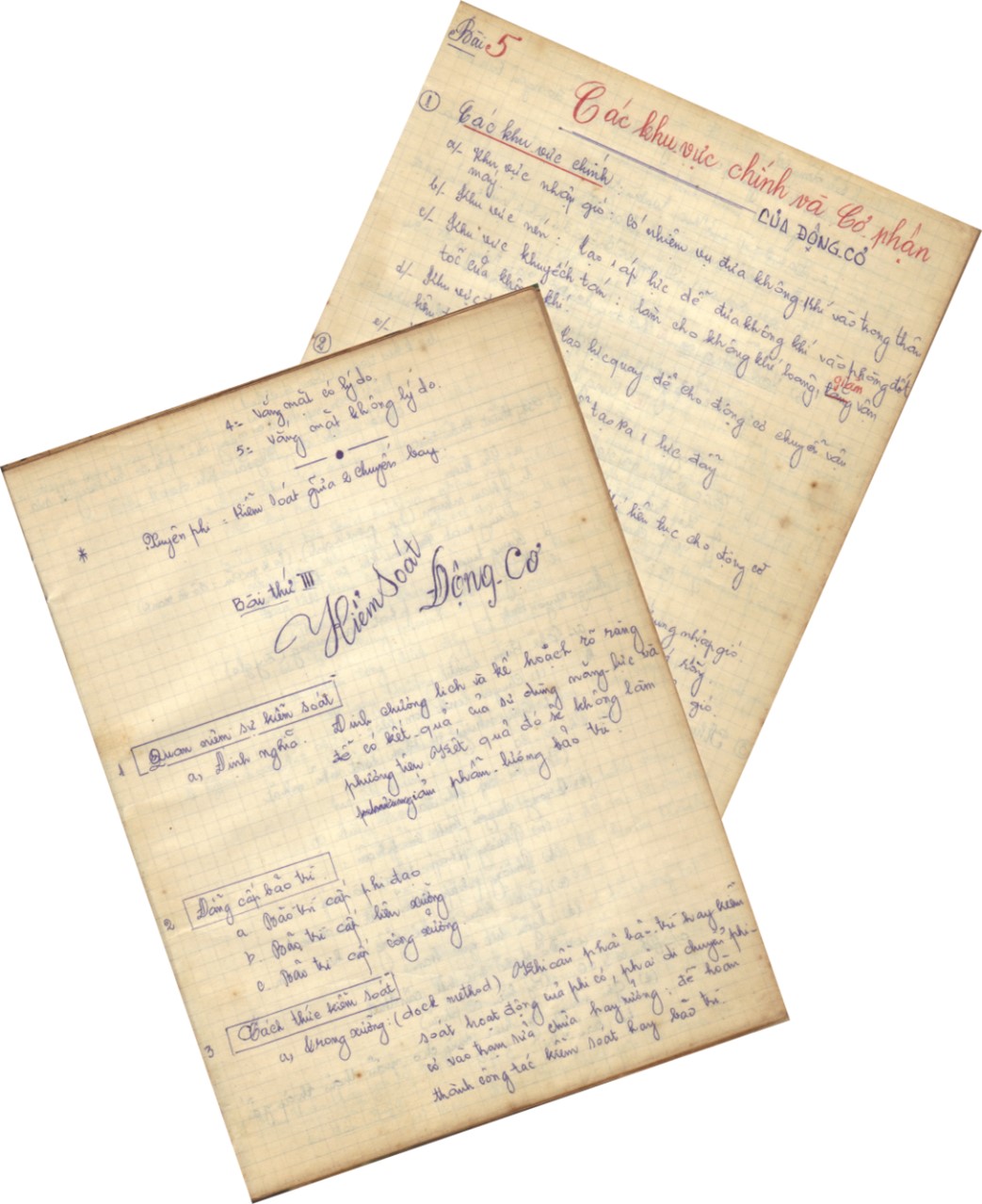 Kỹ thuật vốn khô khan, viết vậy cũng đã nhiều, anh em đọc thấy có gì sai sót cũng thông cảm vì thời gian qua đi quá lâu, trí nhớ và tài liệu có hạn. Bài viết này cũng phải chỉnh sửa bổ sung nhiều lần, bởi vì con người luôn luôn cầu toàn, dù biết mình bị giới hạn về mọi mặt. Dưới đây là vài trang trong cuốn tập thời còn học tại Trường Kỹ Thuật Động Cơ Phản Lực / Biên Hoà 1969-1970 để minh hoạ.