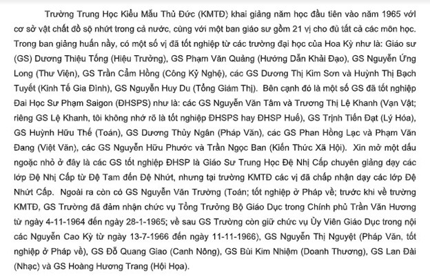 Từ rất nhiều năm nay, tại hải ngoại, khi nhắc lại chuyện giáo dục tai Miền Nam trước 1975, nói đến các trường trung học lớn, đa số mọi người chỉ nói về các trường Petrus Ký, Gia Long, Chu Văn An, Trưng Vương ở Sài Gòn, hay Nguyễn Đình Chiểu, Lê Ngọc Hân ở Mỹ Tho, hay Phan Thanh Giản, Đoàn Thị Điểm ở Cần Thơ, hay Quốc Học, Đồng Khánh ở Huế, ít thấy ai nhắc đến tên Trường Trung Học Kiểu Mẫu Thủ Đức (THKMTĐ), trực thuộc Đại Học Sư Phạm Sài Gòn (ĐHSPSG), mặc dù ngôi trường này đã có mặt từ năm 1965, nghĩa là đã hoạt động được đúng 10 năm, và đã có những cống hiến rất quan trọng cho hệ thống giáo dục của Việt Nam Cộng Hòa (VNCH). Người viết bài này, đã từng phục vụ tại THKMTĐ một thời gian khá dài (1966-1971) với tư cách giáo sư môn Kiến Thức Xã Hội (tên gọi mới của môn Sử Địa tại Trường) và Quản Thủ Thư Viện, cố gắng giới thiệu những nét đặc biệt của trường THKMTĐ khiến nó trở thành biểu tượng của một đường lối và phương pháp giáo dục thật sự tân tiến của VNCH.