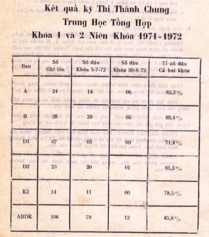 Rất may mắn, người viết bài này đã liên lạc được với em Trần Nam Bình thuộc Khóa 2 hiện đang sinh sống tại Úc. Em Bình đã gửi điện thư cung cấp rất nhiều thông tin liên quan đến thành quả học tập của Khóa 2. Theo những thông tin này, trích ra từ Kỷ Yếu Khóa 2, số thống kê cho thấy đã có tất cả là 91 (79+12 = 91) trên tổng số 106 học sinh dự thi đã đậu kỳ thi Thành Chung Trung Học Tổng Hợp với tỷ lệ rất cao là 85,8% như sau: [27]