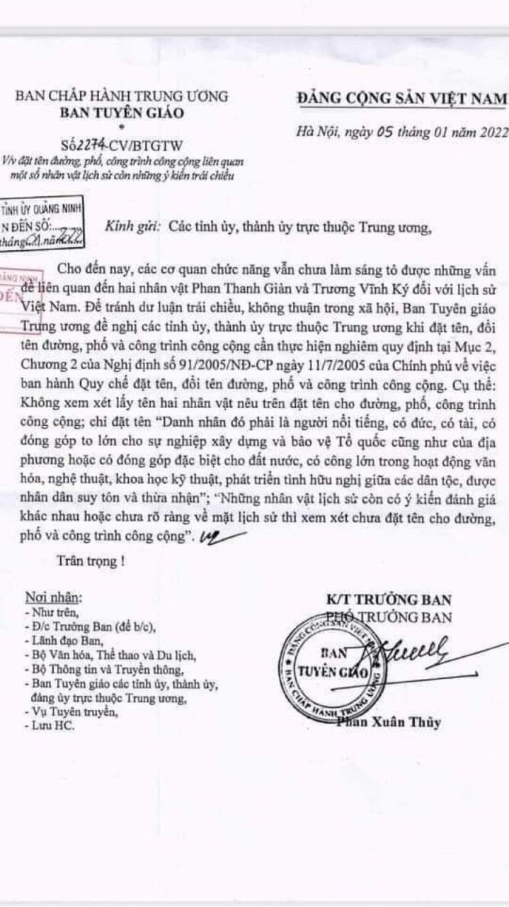 Văn bản Tuyên Giáo ra ngày 5/01/2022 yêu cầu các tỉnh thành không lấy tên Trương Vĩnh Ký và Phan Thanh Giản đặt tên đường và các công trình công cộng. Source: Sachhiem/VOA