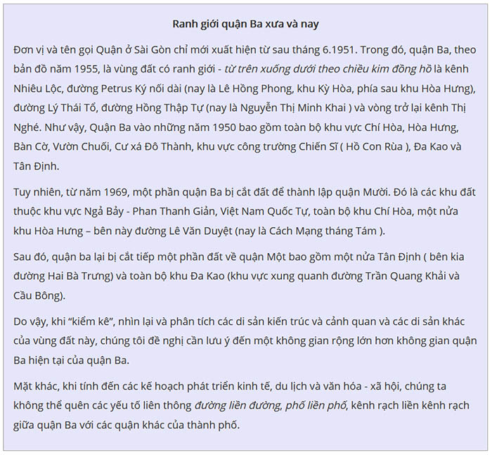 Ăn quận Năm, nằm quận Ba… Ai đó đã đúc kết thành tục ngữ. Nhưng quận Ba đâu chỉ có những con đường biệt thự “cây dài bóng mát” – mơ ước nhà cửa của thị dân. Quận Ba còn có nhiều “kho báu” khác mà người viết nhân dự Hội thảo “Tiềm năng phát triển đô thị của quận Ba, TP.HCM” vào ngày 22.12 vừa qua, đã đề nghị khai thác. Mong rằng việc nhận diện các kho báu di sản của từng quận/huyện cụ thể sẽ góp thêm việc thúc đẩy kinh tế di sản cho toàn thành phố và các nơi khác.