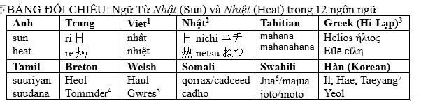 Bảng Đối Chiếu trình bày ở đây giữa chữ nhật (sun) và nhiệt (heat) cho thấy có nhiều ngôn ngữ đã sáng tác nên từ chỉ heat (nhiệt) từ chữ dùng để chỉ mặt trời (sun). Những ngôn ngữ như Breton, Welsh lại dùng âm giống như Helios tiếng Hy Lạp để chỉ mặt trời, nhưng lại dùng ngữ âm khác, có lẽ phổ biến vào nhiều thế kỉ sau, như Heol hay Haul (Heat), để chỉ sức nóng, tức nhiệt. Từ nguyên học theo trình bày ở đây cũng cho thấy từ nguyên của từ tiếng Anh heat (nhiệt) có thể là helios (nhựt/nhật), nghĩa mặt trời tiếng Hy-Lạp, và liên hệ từ nguyên nầy là liên hệ mô phỏng (metaphor) có trong thời ban sơ của ngôn ngữ, không để ý đến ranh giới các ngôn ngữ như trong thời hiện tại. Trong từ nguyên học (etymology)thông thường, chữ heat sẽ được truy về những từ cùng gốc là hot (nóng) hay những từ thuộc tiếng Anh cổ (hætu), v.v., với liên hệ chung giữa heat và hætu vẫn là tính arbitrary, tức định để hay tính trơ, không cần biết đến nguyên nhân hay gốc gác về ý nghĩa cốt lõi của từng từ như heat (sức nóng) và hætu, và giữa heat (sức nóng) với các từ thuộc ngôn ngữ khác dùng để chỉ mặt trời. Ngoài ra trong tiếng Sumer, cách đây 5000 năm, có từ [ud] hay [u] dùng để chỉ mặt trời và cũng chỉ sức nóng, cơn sốt, hoặc mùa hè. Trong tiếng Việt, chữ nóng liên hệ đến chữ 燶 [nung][nóng] (đốt nóng) và Thần Nông (神農 [Shennong]), ông tổ nghề nông, và cũng là Viêm Đế (炎帝 [Yandi]), tức thần lửa (sinh ra sức nóng). Theo chân Thần Nông, chữ nong (侬 hoặc 儂), ngày xưa dùng để chỉ đại từ ngôi thứ 1, và ngày nay vẫn là đại từ ngôi 2 (you) trong tiếng Ngô Việt (Wu), khu vực Thượng Hải, Chiết Giang, và cũng chính là họ Nông, liên hệ đến canh nông, và có thể có biến âm là Nùng, như họ của Nùng Trí Cao (儂智高, 1025-1055), lãnh tụ người Tày Nùng và người Tráng (Quảng Tây) đứng lên đòi tự trị với nhà Tống (960-1279) và nhà Lý (1009-1225).