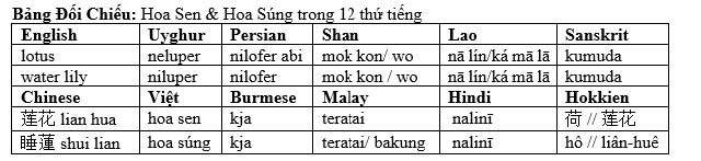 Trong cặp liên (莲) và sen (莲), chữ liên có phát âm quan thoại hiện nay là [lian]. Nhưng hoa sen thoạt trông rất giống hoa súng tức water lily (bông huệ nước hay pông loa kèn (Mường)), và như thế trong nhiều thứ tiếng, có khuynh hướng dùng chung một ngữ âm hay tên gọi chung cho hai thứ, hoa sen và hoa súng, như trình bày trong Bảng Đối Chiếu.