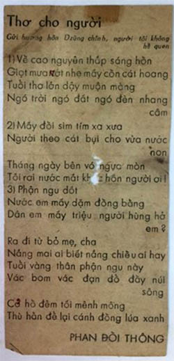 Năm 1969 đọc tin buồn trên báo anh mất ngoài mặt trận, không biết xúc cảm nào đã xui tôi lặng lẽ có đôi vần kính viếng thả vào hư không như một nén tâm hương: “Thơ cho người” (Ký bút danh Phan Đồi Thông, đăng nhật báo Saigon 1969).