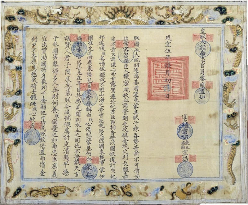 “Người Pháp đã chiếm Thuận Hoá đánh đuổi Việt vương. Du dũng, nghĩa đoàn các xứ Lạng (Sơn), Bình (Ninh), Hưng Hoá hiện đang cùng người Pháp chống cự. Vậy hãy gửi những người thông hiểu tập quán, thành thực có khả năng chia ra đi sang Thuận Hoá của Việt Nam, và các nơi dò thám cho xác thực tình hình người Pháp đánh bại Việt vương. Bất kể sử dụng binh lính hay con buôn đều được. Cần giữ kín và làm ngay.” [7]