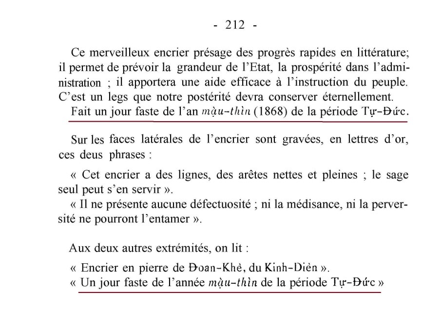 Vua tự Đức đã thường dùng cái nghiên đó. Thực là một quốc bảo, còn giữ được đến bây giờ, cũng là một sự lạ, vì chưa ai ăn cắp hay đập vỡ.