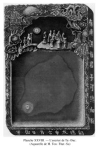 [12] L’écrin, dès l’abord, retient l’oeil. La nacre des caractères, soigneusement incrustés, s’irise comme des fragments de prisme sur le fond brillant de laque noir. BAVH, 7-8/1917, E. Gras : « Sur un encrier de Tu-Duc » tr. 207.