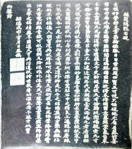 Tôi lật bề trái xem trước, thì là một bài văn “ngự chế” của đức Dực Tôn, đề cao đặc tánh có một không hai của Tức Mặc Hầu. Chữ khắc nổi, mạ vàng lên trên, sắc sảo vô song, tiếc vì ảnh chụp không đủ sức làm lộ ra nét độc đáo này. Tôi xem qua hộp đựng, thì là một cái hộp rất mỹ thuật làm bằng đồi mồi Hà Tiên, trong trẻo và vàng hực, làm cho bài thi “ngự chế” khắc lên nắp trên nắp dưới cái hộp càng khiêu gợi; theo tôi, nội cái hộp cũng đủ là một mỹ-phẩm tuyệt tác … [8]