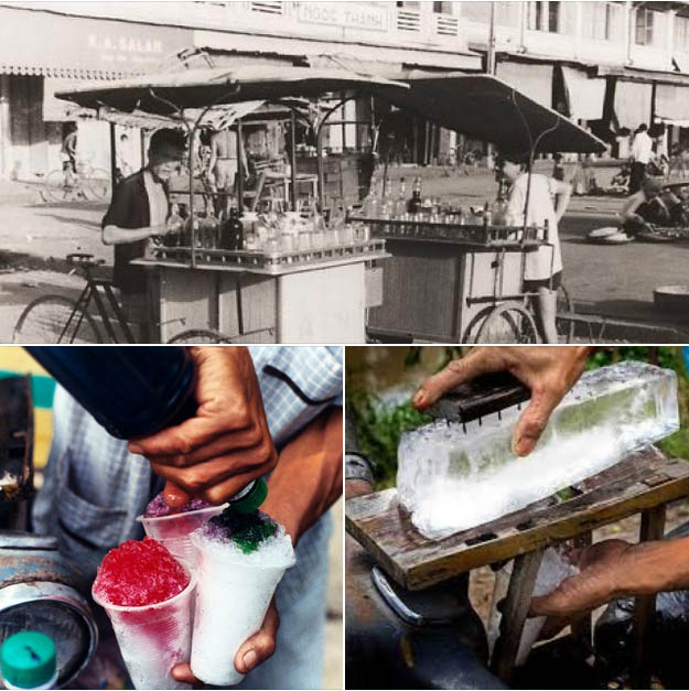 Mà lạ, cái trường danh giá Petrus Ký của tụi mình, đám xe hàng rong lại chình ình trước cổng (?!). Không đông đảo, nhưng cũng đủ hàng ăn vặt, dành cho những thằng trốn học, hoặc không biết vì lý do gì, vào giờ lên lớp , lại còn bên ngoài cổng trường …ăn cháo huyết !!!. Tôi còn nhớ như in, chiếc xe nước đá nhận với một lô chai đủ màu xanh, đỏ, vàng … học trò khoái màu nào thì anh bán lấy cái chai, trên đó đóng nút bần, nhưng khoét một lỗ nhỏ để xịt vào thõi đá bào nhận ra từ một cái ly nhựa .Chính cách chế biến này mà sản phẩm có tên là “đá nhận”.
