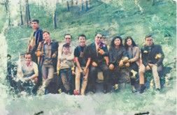 Hình 2: Anh Tụi (người đứng phía sau, bên góc trái) cùng với võ sư chưởng môn Vovinam và phái đoàn làm phim Vovinam tại thác Prenn, Đà Lạt năm 1972.Từ phải sang trái: Lưu Thăng, Thạch thị Minh, Nguyễn thị Nga, thầy Lê Sáng, Lê Công Danh, ông Tân, Phạm Hữu Dũng, Nguyễn Đức Quỳnh Kỳ,Phạm Đình Thái (Hình từ anh Đuợc, chú thích theo hai anh Lưu Thăng và Lê Công Danh)