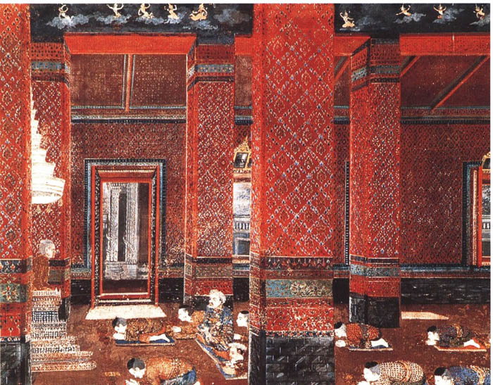 Việc tổ chức triều đình cũng dựa trên khuôn mẫu tương tự. Vua Miến Ðiện có bốn chính hậu (principal queens) và bốn thứ phi (secondary rank). Bốn chính cung được đặt tên là Bắc Cung Hoàng Hậu, Nam Cung Hoàng Hậu, Ðông Cung Hoàng Hậu, Tây Cung Hoàng Hậu tượng trưng cho bốn phương chính còn bốn thứ phi được đặt tên theo bốn phương bàng[4]. Nhiều tài liệu cho thấy vào thời xưa, cung điện của các hậu phi được bố trí chung quanh cung vua theo các hướng. Triều đình cũng có bốn đại thần tượng trưng cho tứ thiên vương trong giáo lý Phật giáo. Mô hình này hiện hữu tại Xiêm La, Chân Lạp, Java. Ở Chân Lạp, bốn đại thần được mệnh danh là “tứ trụ” và theo truyền thống, những viên quan đó không phải chỉ nắm giữ trọng quyền mà còn có nhiệm vụ bảo vệ bốn phương chính.[5]