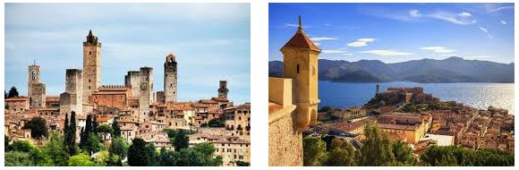 Thành phố Florence là cái nôi của văn hóa Phục Hưng, thành phố Pisa đặc biệt đối với thế giới vì cái tháp nghiêng vẫn đứng vững tuy đi ngược với qui tắc về vật lý, Siena với di tích và nghi lễ cổ truyền vẫn còn tồn tại từ thời Trung Cổ, đảo Elba có dấu ấn lịch sử của Âu Châu vì là nơi giam lỏng Nã Phá Luân đại đế, San Gimignano là ngôi làng có tính cách cổ tích hiếm có của nước Ý….