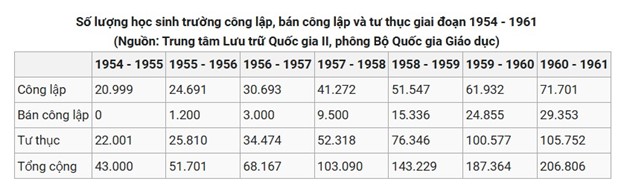 “Nền giáo dục miền Nam 1954-1975 mang tính xã hội hóa rất cao, nếu không muốn nói triệt để. Mọi cá nhân hoặc đoàn thể/ tổ chức hợp pháp đều có quyền mở trường dạy học từ mẫu giáo đến đại học theo quy định của Bộ Quốc gia giáo dục và trong khuôn khổ của luật lệ đương thời. Nhờ vậy hệ thống giáo dục tư nhân phát triển rất mạnh, cùng với chính phủ chăm lo cho nền giáo dục quốc dân. Một quy chế tư thục đã sớm được ban hành do Dụ số 57/4 ngày 23.10.1956 cho phép mở trường tư ở cả 4 cấp Mẫu giáo, Tiểu, Trung và Đại học, kể cả trường tư thuộc mọi tôn giáo đang hoạt động hợp pháp. Nhờ vậy, tính đến tháng 4.1968, theo thống kê của Bộ Giáo dục, Việt Nam có 1.917 trường sơ tiểu học với 359.589 học sinh và 6.406 giáo chức, chiếm 18,25 % tổng số học sinh tiểu học toàn quốc; có 428 trường trung học tư thục với 308.149 học sinh và 8.296 giáo chức, chiếm 65,43% tổng số học sinh trung học toàn quốc (xem Giáo dục nguyệt san, số 25, tháng 12.1968, tr. 10). Đến niên học 1970-1971, trường tư thục đảm nhiệm 17,7% học sinh tiểu học và 77,6% học sinh trung học. Sang đầu năm 1975, đã có khoảng 1,2 triệu học sinh học ở hơn 1.000 trường tư thục cấp tiểu học và trung học.” [5]