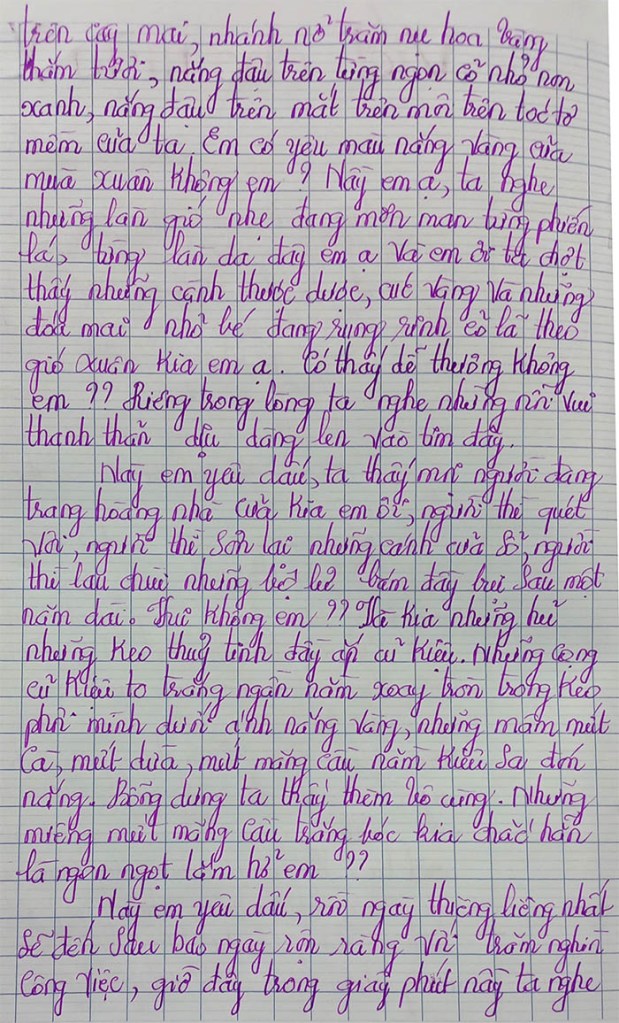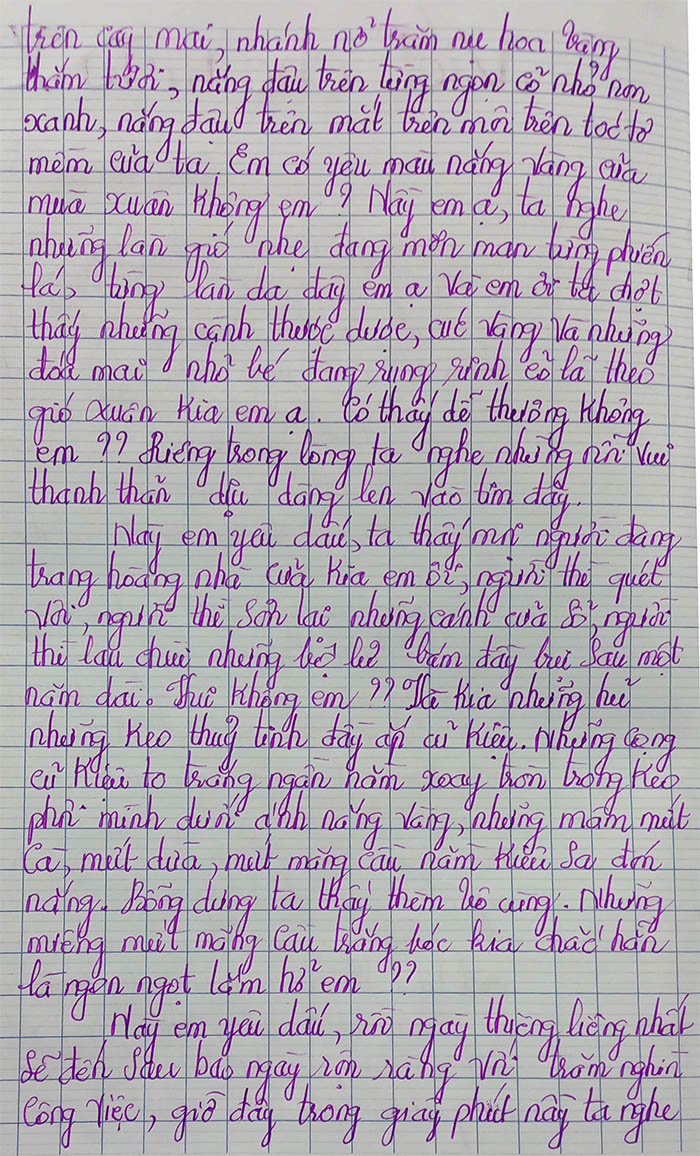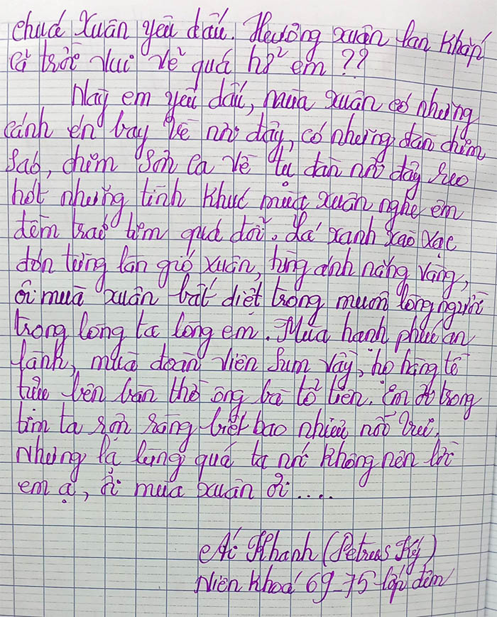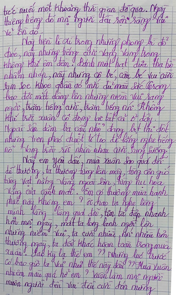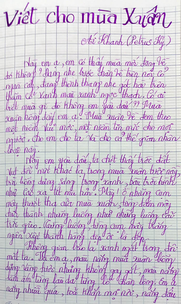 Này em yêu dấu, mùa xuân sao quá đỗi dễ thương, ta thương từng làn mây từng cơn gió, từng vạt nắng vàng ngoài sân, từng nụ hoa vàng của cành mai. Em có thương mùa hạnh phúc này không em?? Ôi chao ta nghe lòng mình lâng lâng quá đỗi, tim ta đập nhanh hơn mọi ngày, mắt ta long lanh ngời lên những niềm vui, ta cười nhiều nói nhiều hơn thường ngày, ta đổi khác hoàn toàn trong mùa xuân. Sao kỳ lạ thế em ?? Những lúc trước có bao giờ ta vui như thế này đâu. Mùa xuân nhiệm màu quá hở em ? Xuân làm mọi người, muôn người đều vui đều cười đón mừng Chúa Xuân yêu dấu. Hương xuân lan khắp cả trời, vui vẻ quá hở em ?