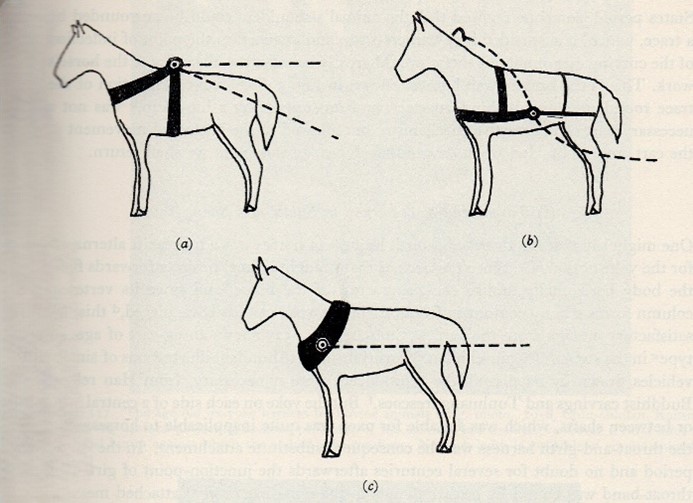 … Lối thắng cương cổ điển (mà chúng ta tạm gọi là thắng bằng cổ và bụng) chỉ dùng được một phần nhỏ động lực của con vật, không tạo được năng suất tổng hợp và vì thế hiệu năng rất kém… Cách thắng cương này được dùng mãi cho tới thời Trung Cổ ở châu Âu, và dường như được dùng khắp mọi nơi, khắp mọi nền văn hóa và đều thiếu hiệu quả như nhau cả. Chỉ có một nền văn minh cổ đã thoát ra khỏi được phương pháp này và tìm ra một cách thắng cương hữu hiệu, đó là Trung Hoa.[6]