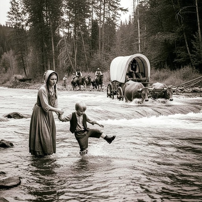 Khi xe bắt đầu lội qua dòng nước dữ, hỗn loạn xảy ra: bánh xe rên rỉ, bò kéo hoảng loạn, nước cuồn cuộn dâng cao. Samuel trượt chân trên hòn đá trơn, lăn về phía dòng chảy xiết. Không chút do dự, Clara nắm chặt tay em, chân bám vào lòng suối trái tim đập thình thịch. “Nắm chặt!” em hét giữa tiếng nước gầm. Hình ảnh ấy phản ảnh tinh thần dũng cảm vượt tuổi đời của người Mỹ: dám đối mặt nguy hiểm, không bỏ rơi ai, dù là em bé, dù là chính mình.