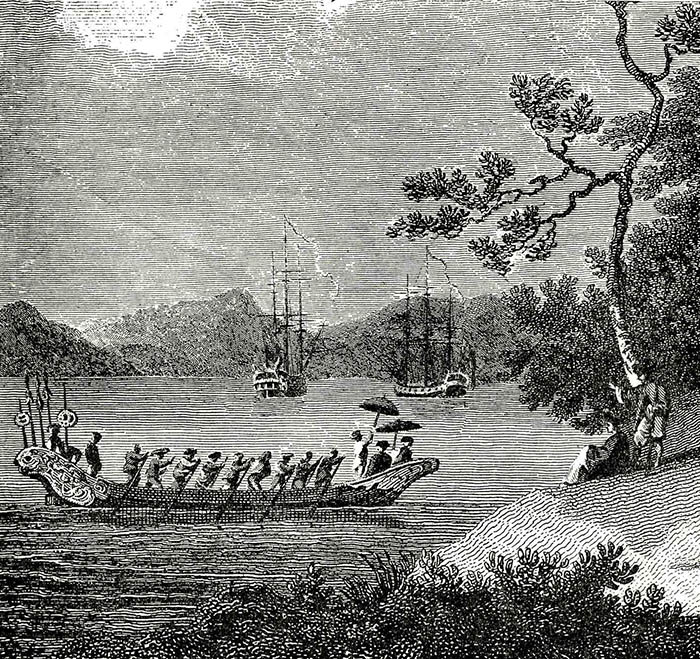 Hình 1: Vịnh Tourane xa xa có neo hai chiếc tàu Lion và Hindostan (W. Alexander 1793)