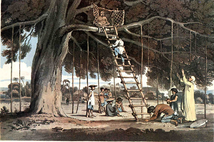Trên cành chính của cây đa (Ficus Indica) tôi nhìn thấy một cái lồng đan, hai cánh cửa mở buộc chặt vào hai cành cây. Bên trong là một tượng Phật gỗ cùng hình dáng và kiểu ngồi như tại các đền ở Trung Hoa. Ðứa trẻ đi hầu nhà sư đứng bên cạnh cầm một đĩa đựng than đang cháy.