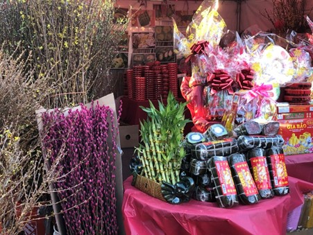 Lác đác ở những hàng quán, khu chợ có người Việt, đã thấy bày bán những bloc “lịch ta” in ấn đâu từ quê nhà gửi sang, cùng những hộp bánh mứt, hầu hết cũng đều thấy dòng chữ “Made in Việt Nam” mà thấy vui vui trong bụng. Cũng đủ thứ mứt bí, mứt dừa, mứt gừng, hạt sen và cả… “thèo lèo, cứt chuột,” còn có thêm cả áo quần, tiền vàng, giấy bạc cúng ông Táo và đưa rước ông, bà.