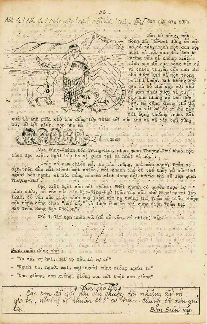 Bên bờ sông, một nông dân Mã Lai đứng ôm một bó cỏ tết, cạnh một con cọp nuôi và một con dê. Anh ta đang rầu rĩ không biết tính sao để qua sông, tất cả vì chiếc thuyền của anh chỉ chở được anh và một trong ba thứ trên. Anh không thể qua mà bỏ chú cọp với chú dê gần nhau được vì tuy cọp nhà nhưng có thể đớp bậy, mà cũng không thể để bó cỏ với bà dê vì bà nầy đói bụng thường trực. Kết quả là anh phải chờ các đấng lớp 12AB tới cứu anh ta và các bạn đừng lo, cứ tới giúp, cọp nhà mà !