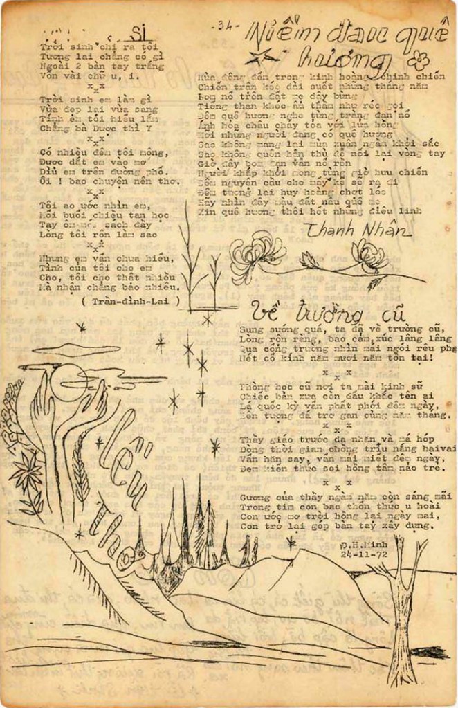 | Si Trời sinh chi ra tôi Tương lai chẳng có gì Ngoài hai bàn tay trắng Vốn vài chữ u, i. Trời sinh em làm gì Vừa đẹp lại vừa sang Tính em tôi hiểu lắm Chẳng bà Dược thì Y. Có nhiều đêm tôi mộng Được dắt em vào mơ Dìu em trên đường phố Ôi ! Bao chuyện nên thơ. Tôi ao ước nhìn em, Mỗi buổi chiều tan học Tay ôm mớ sách đầy Lòng tôi rộn làm sao Nhưng em vẫn chưa hiểu, Tình của tôi cho em Cho, tôi cho thật nhiều Mà nhận chẳng bao nhiêu. Trần Đình Lai | Niềm đau quê hương Mùa đông đến trong kinh hoàng chinh chiến Chiến trận kéo dài suốt những tháng năm Bom nổ trên đất mẹ dậy bừng Tiếng than khóc âm thầm như réo gọi Đêm quê hương nghe từng tràng đạn nổ Ánh hỏa châu cháy tỏa với lửa hồng Hỡi những người đang có quê hương Sao không mang lại mùa xuân ngầm khởi sắc Sao không quên hận thù để nối lại vòng tay Giờ đây bom đạn vẫn nổ rền Người khắp khởi mong từng giờ hưu chiến Đêm nguyện cầu cho mấy kẻ sẽ ra đi Đêm tương lai huy hoàng chợt lóe Hãy nhìn đây màu đất nâu quê mẹ Xin quê hương thôi hết những điêu linh. Thanh Nhân |
