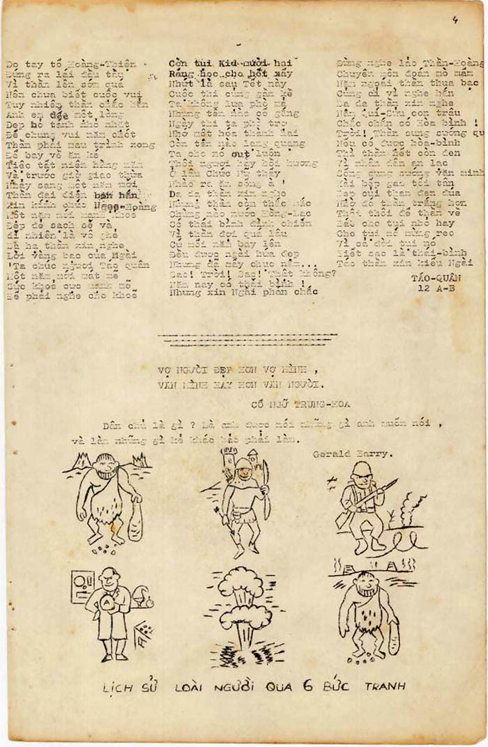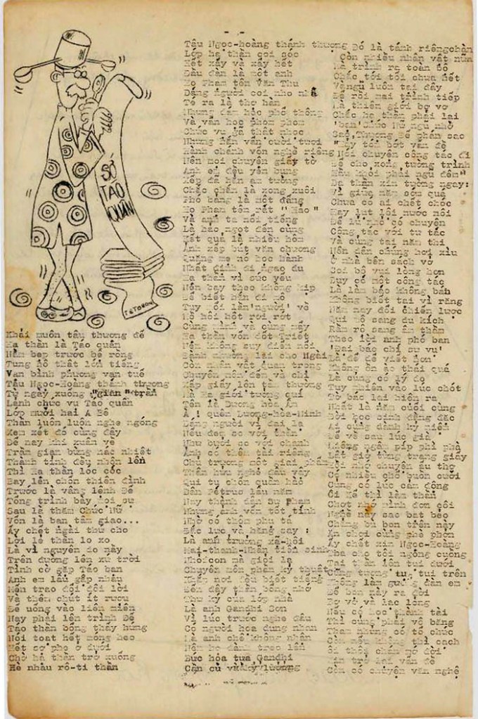 | Khải muôn tâu thuợng đế Hạ thần là Táo quân Nằm bẹp trước bệ rồng Tung hô thật lớn tiếng Vạn bình phương vạn tuế Tâu Ngọc Hoàng thánh thuợng Từ ngày xuống “gian” trần Lãnh chức vụ Táo quân Lớp mười hai A Bê Thần luôn luôn nghe ngóng Xem xét đó cùng đây Để nay khi xuân về Trần gian bừng náo nhiệt Thành tỉnh đều nhộn lên Thì Hạ thần lóc cóc Bay lên chốn thiên đình Trước là vâng lệnh Đế Tổng trình bày mọi sự Sau là thăm Chức Nữ Vốn là bạn tâm giao… Ấy chết Ngài thứ cho Lời lẽ thần lo xo Là vì nguyên do này Trên đường lên xứ trời Tình cờ gặp Táo bạn Anh em lâu gặp nhau Nên trao đổi đôi lời Và thêm chút ít rượu Để uống vào liên miên Nay phải lên trình Đế Táo thần bỗng thấy hứng Nói toạt hết móng heo Hết sợ phe ở dưới Chờ hạ thần trở xuống Hè nhau rô-ti thần Tâu Ngọc Hoàng thánh thượng Lớp hạ thần coi sóc Hết xẩy và xẩy hết Đầu đàn là một anh Họ Phạm tên Văn Thu Dáng người coi nho nhã Té ra là thợ hàn Nhưng dám học phổ thông Và vẫn học phom phom Chức vụ gã thật nhọc Nhưng hắn vẫn cười tươi Hành chánh vốn nghề riêng Nên mọi chuyện giấy tờ Anh em đều yên bụng Xếp đã hẳn am tường Chắc chắn là xong xuôi Phó bảng là một đấng Họ Phạm tên rất “Hảo” Và anh ta nổi tiếng Là hảo ngọt đến cùng Kết quả là nhiều hôm Ảnh xếp bút văn chương Quăng mẹ nó học hành Nhất định đi ngao du Hạ thần vì sức yếu Nên bay theo không kịp Để biết hắn đi mô Tuy mỗi lần ‘người’ về Mồ hôi hột rơi rớt Cùng mình và cùng mẩy Hạ thần vốn dốt triết Nên không suy diễn nổi Đành nhường lại cho Ngài Còn nhân vật quan trọng Chuyên môn đếm và chỉ Xấp giấy lộn tầm thuờng Mà Hạ giới tưởng quí Tên là Dương Hòa Âm À ! Quên Dương-Hòa-Minh Dáng người vĩ đại lạ Nếu đem so với thần Như bưởi so với chanh Ảnh có thêm tài riêng Chủ trương một giai phẩm Thân hữu nghe đâu vậy Qui tụ chốn quần hào Dân Petrus lâu năm Nay thành dân Sư Phạm Nhưng ảnh vốn tốt tính Nhờ có thêm phụ tá Đắc lực và hăng say : Là anh trưởng xã hội Mai-Thanh-Nhân tiên sinh Nhỏ con mà giỏi lạ Chuyên môn phần kỹ thuật Khắp nơi đều biết tiếng Đến đây thần bỗng nhớ Thư ký của lớp nhà Là anh Gandhi Sơn Vì lúc trước nghe đâu Có người họa dung nhan Mà anh chê không nhận Nên họ đành treo lên Bức họa tựa Gandhi Cần cù và kỹ lưỡng Đó là tánh riêng chàng Còn nhiều nhân vật nữa Mà trình ra toàn bộ Chắc tới tối chưa hết Và ngủ luôn tại đây Để rồi mai trình tiếp Mà thiên giới bơ vơ Chắc hạ thần phải lại ‘Bạn’ Chức Nữ ngủ nhờ Sao Thượng Đế phán sao “Hãy tóm bớt vấn đề Nói chuyện công tác đi Để cho xong tường trình Hầu khỏi phải ngủ đêm” Dạ thần xin tường ngay : Vì giữa năm sớm quá Chưa có ai chết chóc | Hay lụt lội nước nôi Để lũ nhỏ có chuyện Công tác với tư tác Và cũng tại năm thi Nên dân chúng hơi xìu Ở nhà bên sách vở Coi bộ vui lòng hơn Duy có một công tác Là làm báo không bán Không biết tại vì răng Năm nay đổi chiến lược Qui mô sang du kích Rầm rộ sang âm thầm Theo lời anh phó ban ‘Đại báo chí sự vụ’ Là để dễ viết hơn Không ồn ào thái quá Là cũng có lý do Tuy nhiên vào lúc chót Tờ báo lại hiện ra Nhất là năm cuối cùng Đời học sinh dằng dặc Ai cũng dành kỷ niệm Để về sau lúc già Miệng ngậm píp phì phà Lật dỡ từng trang giấy Hồi nhớ chuyện ấu thơ Có nhiều chỗ buồn cười Cũng có lúc cảm động Ôi kể thì làm thần Chợt nhớ mình đơn côi Nghề này sao bạc bẽo Chẳng bù bọn trên này Ăn chơi cùng phè phỡn Ấy chết xin Ngọc Hoàng Tha cho tội ngông cuồng Tại thần lộn tụi dưới Cũng tương tự tụi trên Không làm gương đàn em Để bọn này ra đời Bơ vơ và lạc lõng Nếu có học thành tài Thì cũng phải vô băng Tham nhũng có tổ chức Còn nếu không thì cạch Ôi thôi chán mớ đời Xin trở lại vấn đề Còn có chuyện văn nghệ Do tay tổ Hoàng-Thiện Đứng ra lái đầu tàu Vì thần lên sớm quá Nên chưa biết cuộc vui Tuy nhiên thần chắc hẳn Anh em dốc một lòng Dẹp bỏ tánh nhỏ nhặt Để chung vui năm chót Thần phải mau trình xong Để bay về ăn ké Tiệc tất niên hằng năm Và trước giờ giao thừa Nhảy sang một năm mới Thần đại diện bọn hắn Xin kính chúc Ngọc Hoàng Một năm mới mạnh khỏe Đẹp đẽ sạch sẽ và Dĩ nhiên là vô ghẻ Dạ hạ thần xin nghe Lời vàng bạc của Ngài “Ta chúc ngươi Táo quân Một năm mới mát mẻ Sức khỏe cực mạnh mẽ Để phải nghe cho khỏe Còn tụi kid mười hai Rán học cho hết xẩy Nhứt là sau Tết này Cuộc thi cũng gần kề Ta không lựa phò mã Nhưng tên nào cố gắng Ngày thi ta phò trợ Nhớ một hóa thành hai Còn tên nào lạng quạng Ta cho nó out luôn Thôi ngươi hãy hồi hương Ở lâu Chức Nữ thấy Nhào ra ăn sống à” Dạ dạ thần xin nghe Nhưng thần còn thắc mắc Chừng nào nước Hồng-Lạc Có thái bình đình chiến Vì thần đợi quá lâu Cứ mỗi năm bay lên Đều được Ngài hứa đ