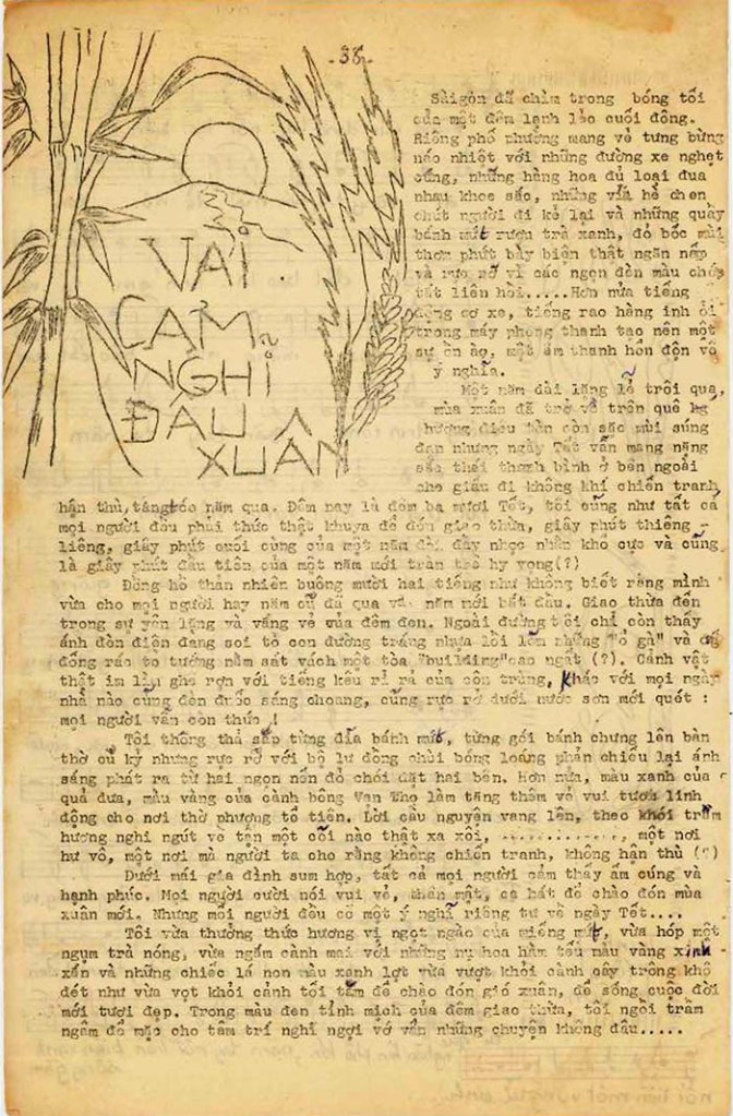 Ngày đầu xuân người ta chúc nhau toàn là điều lành, những điều may mắn, người ta cầu nguyện cho riêng mình, cho sự sung sướng của mình cho đến nỗi những điều mê tín như coi bói, xin xăm, họ cũng hưởng ứng nhiệt liệt … Nhưng có lẽ trong ngày đầu xuân, không có một ai cầu nguyện cho đất nước sớm thanh bình, quốc gia thịnh vượng, người dân không còn những nỗi khổ đau để yên ổn làm ăn … Có lẽ tất cả mọi người ai ai cũng đều biết rằng đất nước chúng ta đã trải qua hai mươi mấy năm chinh chiến, đất nước ta đã bị chia đôi, người dân Việt Nam ta đã giết nhau ! Chiến tranh đã giết đi cha mẹ của biết bao trẻ thơ vô tội, những đứa trẻ được các vị tu sĩ giàu lòng từ thiện nuôi nấng, săn sóc, dạy dỗ trong các cô nhi viện … Chiến tranh đã giam hãm người dân chất phác vào những xóm lao động nghèo nàn, lụp sụp với những con đường hẻm chằng chịt tối tăm đọng nước … Chiến tranh đã sản xuất biết bao sự bất công, biết bao tệ đoan xã hội … Chiến tranh đã chôn vùi tuổi trẻ trong sự hận thù vô lý, vào cuộc sống xa hoa, đua đòi vật chất, người thanh niên sống ở thời đại này, trong xã hội này không còn lý tưởng, tương lai đối với họ thật là đen tối mù mịt, làm sao tránh khỏi sự cám dỗ, sự mê hoặc của những lạc thú, sự đua đòi, chạy theo cuộc sống vật chất, theo cái gọi là “phong trào Hippies”, cái gọi là hợp thời, với những y phục lố lăng ngoại lai không dân tộc tính … trong các quán ăn – gọi là quán ăn nhưng thật ra chỉ là các quán rượu, các “bar” sang trọng chứa đựng tất cả những gì xấu xa, tệ hại nhất của xã hội. Người thanh niên quần áo bảnh bao, đúng “mốt”, tóc dài khỏi ót, ngồi trầm ngâm trước ly rượu mạnh và thả hồn theo tiếng nhạc kích động, theo khói thuốc lá khét lẹt như thả đi tất cả những sự uất ức (?) chứa trong lòng …