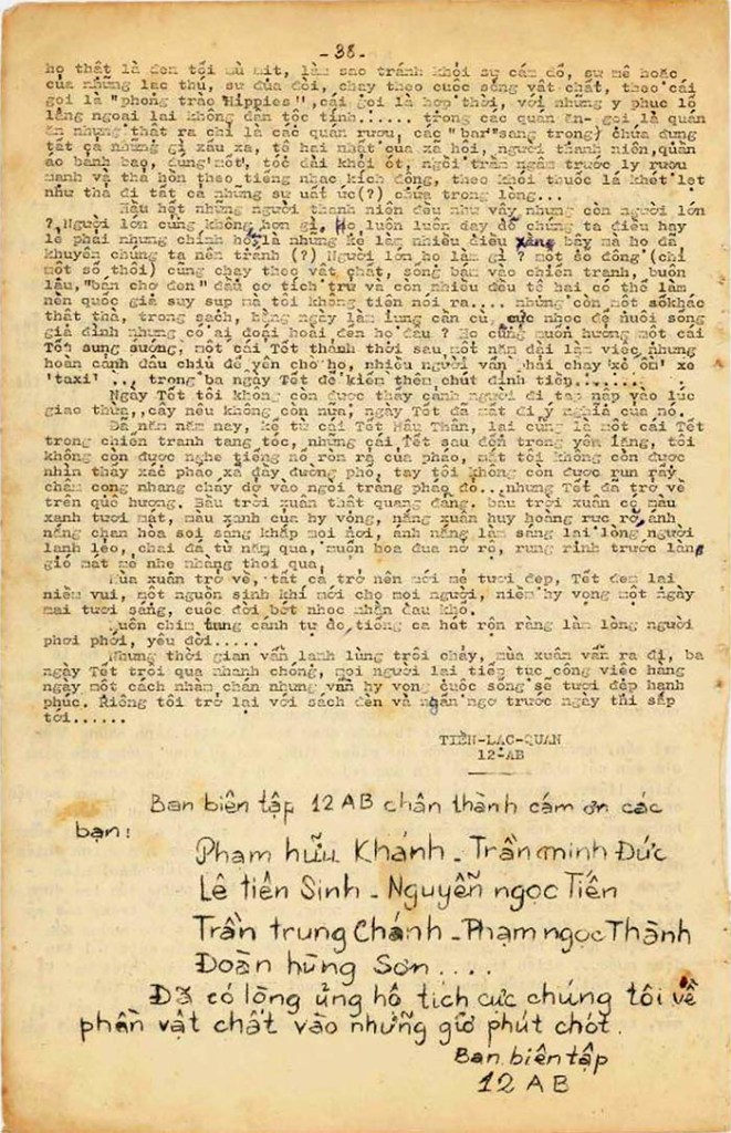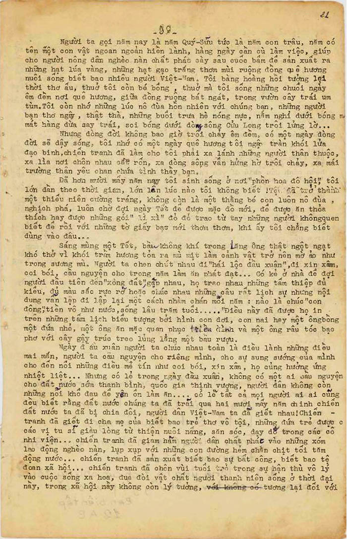 Hầu hết những người thanh niên đều như vậy, nhưng còn người lớn ? Người lớn cũng không hơn gì ! Họ luôn luôn dạy dỗ chúng ta điều hay lẽ phải nhưng chính họ lại là những kẻ làm điều xằng bậy mà họ đã khuyên chúng ta nên tránh (?). Người lớn họ làm gì ? Một số đông (chỉ một số thôi) cũng chạy theo vật chất, sống bám vào chiến tranh, buôn lậu, “bán chợ đen”, đầu cơ tích trữ và còn nhiều điều tệ hại có thể làm nền quốc gia suy sụp mà tôi không tiện nói ra … Nhưng còn một số khác thật thà, trong sạch, hằng ngày làm lụng cần cù, cực nhọc để nuôi sống gia đình nhưng có ai đoái hoài đến họ đâu ? Họ cũng muốn hưởng một cái Tết sung sướng, một cái Tết thảnh thơi sau một năm dài làm việc nhưng hoàn cảnh đâu chịu để yên cho họ, nhiều người vẫn phải chạy “xe ôm”, xe “taxi” … trong ba ngày Tết để kiếm thêm chút đỉnh tiền …